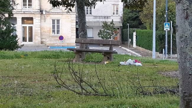 Déchets laissés près d’un banc dans l’espace vert en face de la mairie.